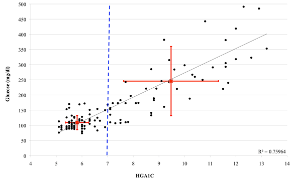 Figure 3: Scatter plot of correlated HgA1C values and blood glucose from the Remote Area