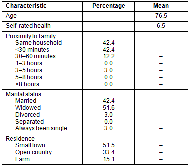 Participants were 66-84 years of age, with a mean age of 76 years (Table 1). Fourteen women were currently married (42%), 14 were widowed (42%), 4 were divorced and currently single (13%), and 1 had always been single (3%). The sample was not racially or ethnically diverse; 100% of the participants identified themselves as White Non-Hispanic. Additional demographic information is included in Table 1.