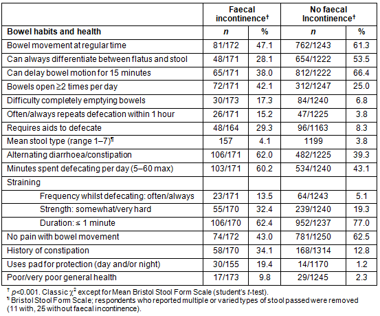 Table 2: Comparison of bowel habits and health in respondents with and without faecal incontinence