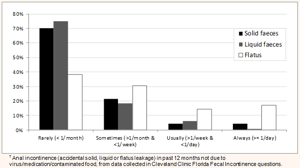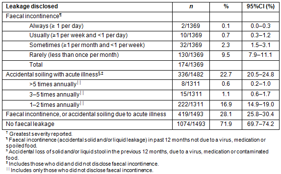 In this study, faecal incontinence was defined as accidental leakage of solid or liquid stool in the previous 12 months that was not caused by a virus, medication or contaminated food.