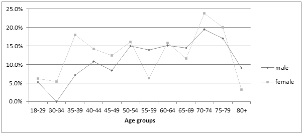 The prevalence (95% CI) of faecal incontinence was 12.7% (10.9-14.5%, Table 1). Overall, there was no significant difference between genders (men 12.6%, women 12.8%) or residence (regional centre or rurally). Prevalence increased significantly with age in men (18-39: 3/65, 4.6% (0.0-9.9%); 40-59: 31/251, 12.4% (8.3-16.4%]; >60: 38/252, 15.1% (10.6-19.5%], p=0.034) but not in women, although it was similar for both genders over 40 years of age (Fig1).