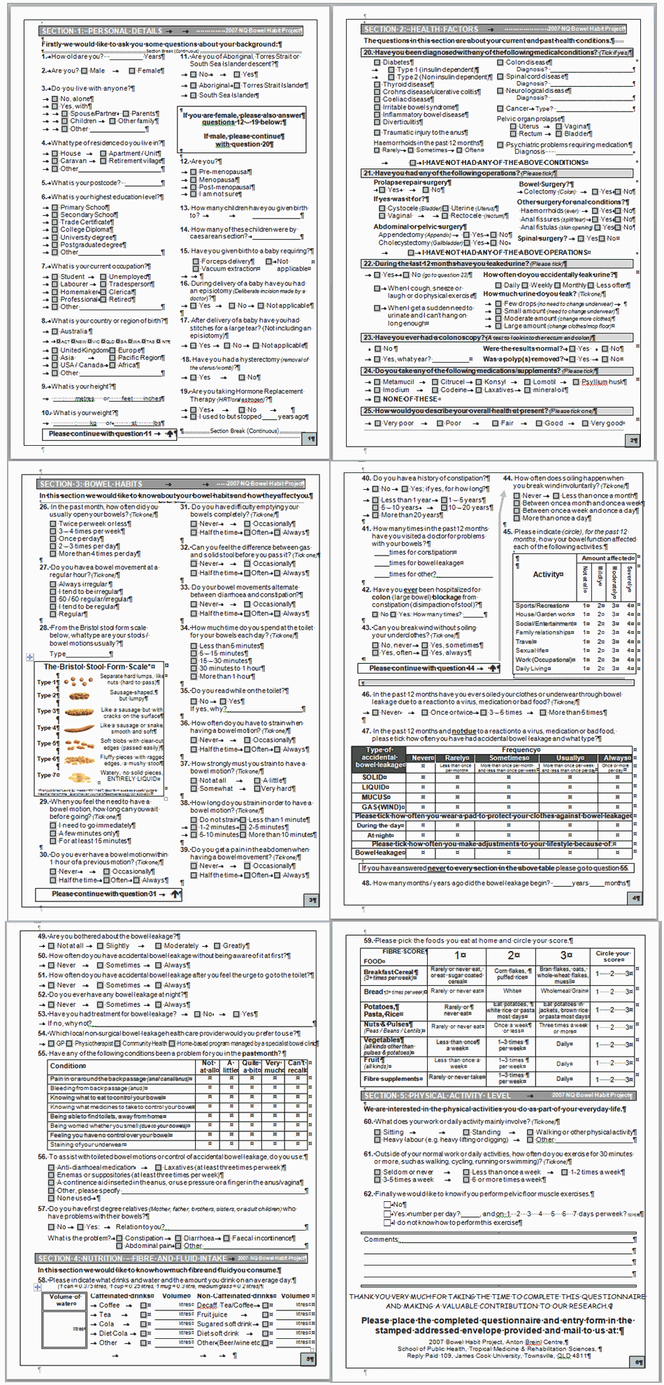 The self-administered questionnaire (Appendix 1), a study information sheet, an incentive leaflet (return of the completed survey provided an opportunity to win a $250 or $50 voucher), an opaque incentive response envelope, and a reply-paid envelope were mailed to everyone on the database. The survey contained 62 questions in five sections including personal demographics (11) with additional questions about female obstetric history (8), health/risk factors (6), bowel habits (32), nutrition (fibre and fluid intake) (2) and physical activity (3).