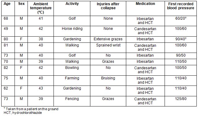 The first patient was taking only irbesartan and hydrochlorothiazide, and the ambulance officer had taken his blood pressure whilst he was still on the ground at the golf course. The officer observed that as soon as the man was loaded into the air-conditioned back of the ambulance, his blood pressure improved to normal. One other patient had her blood pressure taken whilst she was still on the ground. Her blood pressure was also observed to improve dramatically as soon as she was taken indoors to the cool. Dehydration does not seem to be a factor, as most were aware of the potential problem, and had been drinking what they thought was a sufficient amount.
