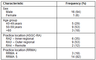 Most participants were male (16/17) and aged from 40 to over 60 years. All participants had an Australian medical degree and the majority were located in regional or small rural centres (Table 2).