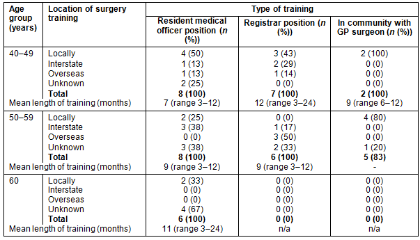 Overall, the mean duration of initial training to acquire surgical skills was 20 months (Table 3), with approximately 50% of training time spent on the acquisition of obstetric/ gynaecological procedural skills. This was consistent across all age groups. The youngest participants' (40-49 years) mean training duration was 30 months, 50% higher than the participant group as a whole. There was a trend in this group for training to have occurred locally and to have been provided by a GP surgeon or through a registrar position.