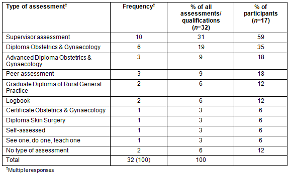 Information about initial qualifications obtained and mode of assessment of initial competency is listed in Table 4. Self-assessment or no assessment was reported as the initial qualification for 18% of participants.