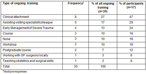The participants reported a range of Continuing Medical Education (CME) activities for their ongoing skill development (Table 5). The most common activities were undertaking a clinical attachment (27%) and assisting a visiting specialist or colleague (17%). No ongoing education was undertaken by 18% of participants.