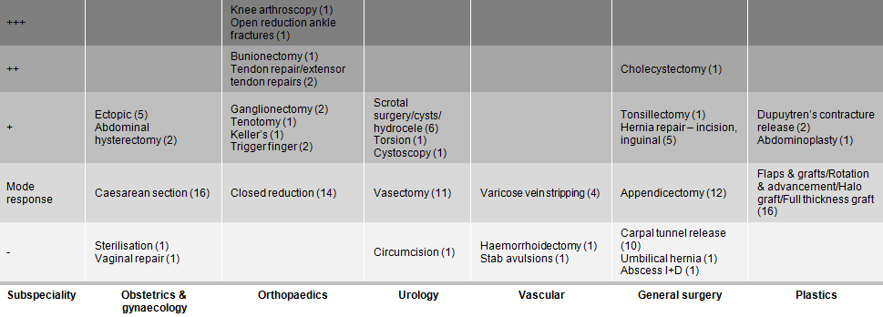 Figure 1 shows the most complicated procedure/s routinely performed by the participants across six identified subspecialty areas. Procedures are organised hierarchically within each subspecialty area according to their complexity (as assessed by the primary researcher, a practising rural GP surgeon). The modal response has been used as a baseline. The most common procedures reported were caesarean sections (94%), flaps and grafts/rotation and advancement flats/halo graft/full thickness graft (94%), closed reduction (82%) and appendectomy (71%). None of the participants undertook flexible endoscopic procedures.