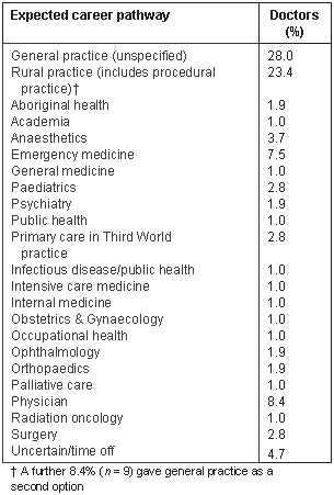 There is an acknowledged shortage of rural doctors in Australia1. It is also evident that, worldwide, fewer graduates are selecting a general practice career than formerly. Allen indicates that only 26% of British medical graduates wanted to enter general practice in the early 1990s, compared with 46% a decade earlier2. In Australia, work with a South Australian intern cohort showed a correspondingly low figure, with a little over 20%, of interns interested in a general practice career3. Goldacre also indicated that where training opportunities in a hospital specialty were limited, doctors were more inclined than in the past to select an alternative specialty to general practice4.