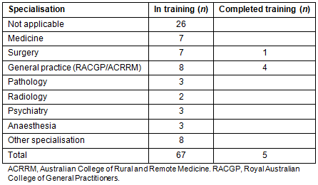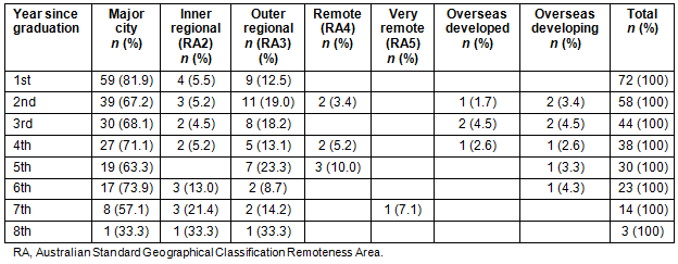 These data support the suggestion that 8 years post-graduation may not be long enough to assess the rural work force outcome14. In addition to the mobile nature of respondents, only five respondents had completed postgraduate training. Of the five who had completed, four were Fellows of RACGP/ACRRM training and one a surgeon (Table 3). All of the RACGP/ACRRM fellows being based in ASGC-RA2 or ASCG-RA3 is a positive indication of the contribution to the rural workforce. Further longitudinal surveying of the enlarging rural cohort will show longer term trends in work location choice.