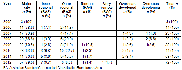 In any given year, between 17.4% and 34.1% of the respondents were located in ASCG-RA2-RA5 areas, an average of 21.8% across the eight possible years (Table 5). Outer regional areas (ASGC-RA3) were the most prevalent rural areas that respondents had chosen to locate themselves in while only one respondent was located in a very remote area (ASGC-RA5) in 2012. However, many of those located in outer regional (ASCG-RA3) and and remote (ASGC-RA4) areas indicated in comments that they visited very remote areas to run clinics as part of their position. In 2012, 15 respondents (20.8%) were located in a rural area (ASGC-RA2-RA5; Table 5). The 2012 data were used for cross-analysis with subsequent questions.