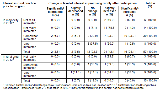 Table 6 shows the interest respondents had prior to completing the RCTS program and the level of change the program brought to their interest in working in a rural area. Results for respondents located in a major city (ASGC-RA1) and rural area (ASGC-RA2-RA5) are shown separately. Observations from this table include the following: