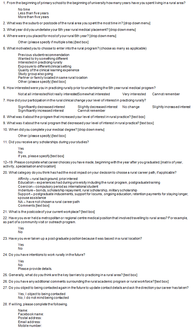 In late 2012 a retrospective study of the rural cohort students of the University of Adelaide MBBS students who completed their fifth year of clinical studies at a rural location in years 2003 to 2010 was conducted. Only domestic students were included in the study. Recruitment involved obtaining email details of the 127 past students of interest using tools such as alumni records, a rural cohort Facebook page and previously known contact details. Details of 124 past students were found. SurveyMonkey was judged to be an appropriate online instrument for this type of study6. Each past student was sent an email directing them to a 28-question self-complete online survey. Respondents were required to confirm informed consent in order to begin the survey.