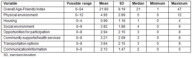 Table 1 shows descriptive results for ratings of age-friendliness. The mean rating on the Age-Friendly Index was 21.6 (median=21) out of a possible total of 54. Scores were the lowest for housing with a mean rating of just under 1 (median=1).