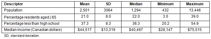 Descriptive statistics for community characteristics are displayed in Table 2. The population sizes of the 29 communities were small, reflective of rural Manitoba as a whole, ranging from 432 individuals in the smallest community to 13 446 in the largest, with a mean of 2501. Considerable variation is also evident in terms of the percentage of residents aged 65 or older, percentage residents with less than high school education, and communities' median income, which ranged from about $28 000 to $75 500 (Canadian dollars).