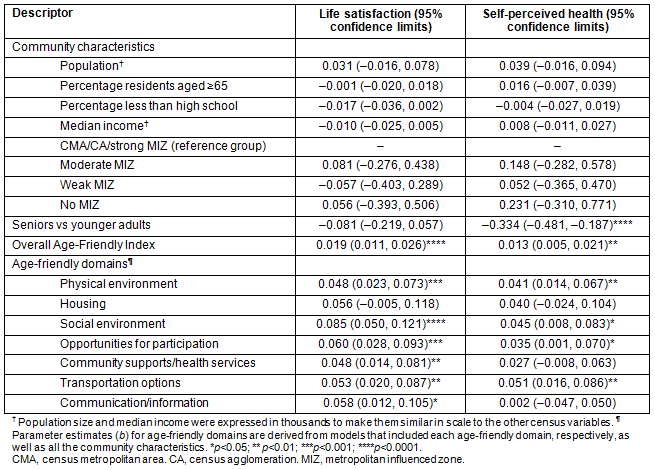 Regression results for the overall Age-Friendly Index (top panel) and individual age-friendly subscales (bottom panel) are shown in Table 3. As can be seen, none of the community characteristics were related to life satisfaction and self-perceived health. Seniors did not differ from younger adults on life satisfaction, but did report being less healthy. Significant effects emerged for the overall Age-Friendly Index, with higher ratings being associated with greater life satisfaction and better perceived health.