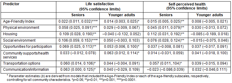 Lastly, separate analyses for seniors versus younger adults were conducted (Table 4). Community characteristics were taken into account in all the analyses. With the exception of community supports/health services, all age-friendly measures were related to life satisfaction among seniors, whereas only the overall Age-Friendly Index, opportunities for participation, and community supports/health services were significant for younger adults. Similarly, several age-friendly measures were related to self-perceived health among seniors (the overall Age-Friendly Index, physical environment, housing, social environment, transportation options), whereas no significant effects emerged for younger adults.