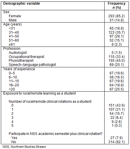 When compared to datasets available for physiotherapists2 and occupational therapists3 in the areas of age and sex as well as number of individuals practising in the Northern Ontario region, the demographic information of survey respondents is highly similar, suggesting appropriate responsiveness amongst different demographic subgroups of the population of interest.