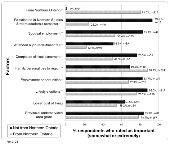 Amongst individuals not originally from Northern Ontario, the strongest recruitment factors included participation in rural/remote education via the NSS combined academic and clinical semester, lifestyle options, the UAG, personal employment opportunities, and spousal employment (Fig1).