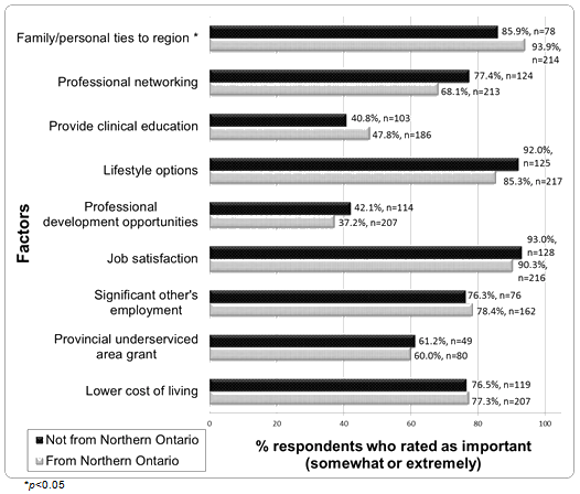 Retention factors most frequently rated highly (Likert ranking ≥ 4 out of 5) amongst individuals originally from Northern Ontario were family/personal ties to the region, job satisfaction, lifestyle options, and Northern Ontario origin.