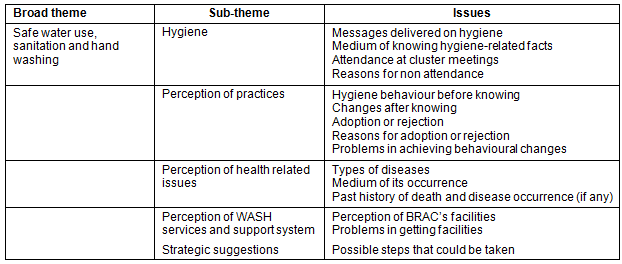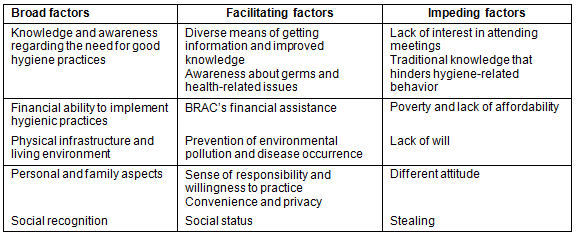All narrative data were collected under three pre-determined broad categories: safe water use, sanitation and hand washing. Data were translated from Bangla to English and checked for completeness. Responses were manually sorted into sub-themes such as hygiene indicators, perception of practices, and health-related issues. Moreover, proposed courses of action were identified from the respondents' responses with the assumption that they themselves could best describe their own problems and needs. The implicit meanings of the narrative responses were analysed to identify and understand factors influencing hygiene knowledge and practice. Facilitating and impeding factors were identified and described under some broad categories that emerged from the in-depth interviews (Table 1). Qualitative responses were quantified as frequencies in possible cases.