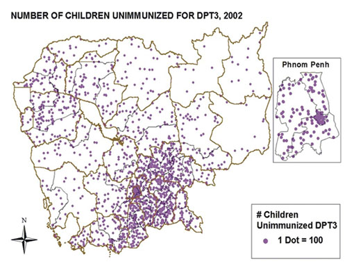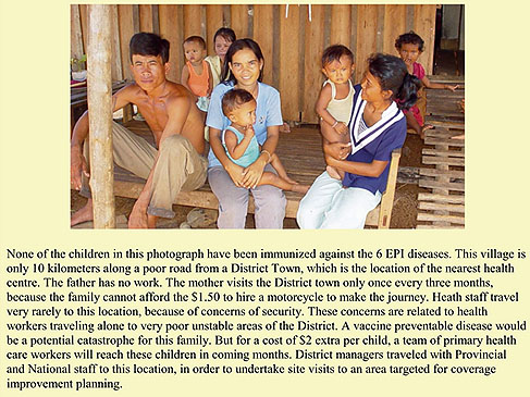 - Microplanning exercises, undertaken by national planners, in partnership with Provincial, District and Health Centre staff, in 14 districts of Cambodia (more than 100 health centres). This involved an analysis of local area (health centre) immunization coverage including mapping, assessment of target populations, identification of numbers and locations of un-immunized children, identification of reasons for their un-immunized status, developing activities for reaching un-immunized children, and costing of proposed additional activities.