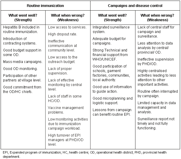 During 2002, Cambodia experienced a fall in routine immunization coverage leading to increased pressure for improved performance. Additional pressure emanated from the recently instituted GAVI system of performance-based payments, determined by the attainment of national immunization projected coverage targets, and the National Poverty Reduction Strategy, which nominates DPT3 coverage as one of the 20 indicators for achievement of the 'millennium development goals'17. At the NIP planning18 workshop in June 2003, the paradox of spectacular immunization campaign success together with flagging routine immunization coverage was analyzed using a problem-solving approach. In contrast to 'static' routine immunization coverage rates, Cambodia, through campaign efforts, has eradicated polio and substantially reduced the reported incidence of measles from 13 827 cases in 1998 to 1361 cases in 20021. The strengths and weaknesses of both campaign and routine immunization which were identified during the workshop are summarised (Table 1). A clear lesson emerging from the strategic planning exercise was that the centralized and vertical nature of campaign efforts was a key ingredient in their success, along with high levels of guaranteed funding, and technical assistance and support for campaigns from partners.