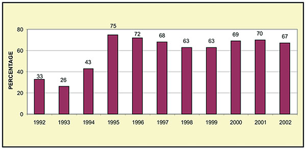 Improved data reporting has also been suggested as a factor contributing to the reported fall in immunization coverage rates. A 2003 data quality audit reported a 98% consistency between health centre statistics and coverage rates reported at the national level16. This compares with an earlier independent audit in 2001, which reported a consistency rate of 87%. It is suggested that the weaknesses present in the system in 2001 may have led to artificially inflated coverage data which, when corrected, contributed in part to the fall in coverage levels in 2002.