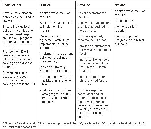 Health workers and District and Provincial immunization managers identified a range of existing barriers to improved coverage, and developed plans which incorporated fully costed strategies to reach unimmunised children. Strategies included management support for health centres, communication (IEC) strategies, mini local-area 'campaigns', and 'extra' travel support for more distant locations. Activities funded under CIP were additional activities to reach additional unimmunised children and were thus complementary to standard health service delivery activities.