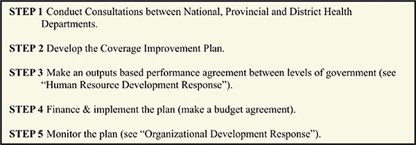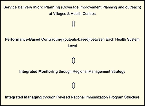 In response to the issue of low coverage and the above identified constraints, and broader institutional developments in the areas of health sector and governance reform, the NIP has developed planning, organizational development and human resource responses to the problem of low coverage. These have included: integration of the NIP plan into the health sector plan; linking of health centre microplanning to District and Provincial health planning; establishment of a national monitoring and management support strategy; and instituting performance-based agreements between levels of government for improved immunization.