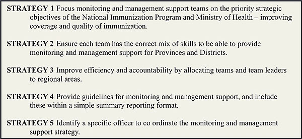 Key elements of the strategy include multiskill composition of national monitoring teams, a regional (geographic) focus for management support (with the country divided into three regional multiskilled management teams rather than technical units operating nationally but within narrowly defined technical areas), and a focused objective of providing management support for Provinces and Districts to raise routine immunization coverage.