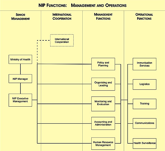 Historically, the emphasis in NIP planning has been on the attainment of technical objectives only. The current structure of the NIP reflects this with an emphasis on technical divisions and a less developed senior management structure that incorporates higher-level functions. The functional framework (Fig 7), developed with the assistance of a human resource specialist and currently under consideration by the NIP, is an illustration of the shift from an almost exclusive focus on operational technical functions towards development of central management functions of policy and national planning, leadership, financing and monitoring and evaluation.