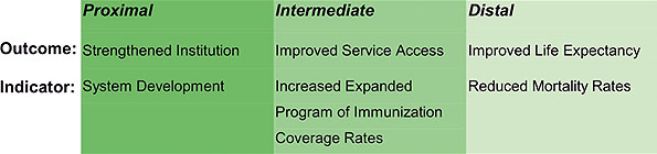 The objective of institutional development is therefore to increase the capacity and optimize usage of public management in order to maximize population access to public services, and in doing so, impact positively on public health. This linking of proximal outcomes (health system developments), intermediate outcomes (health service access) and distal outcomes (health impact) is outlined (Fig 8).