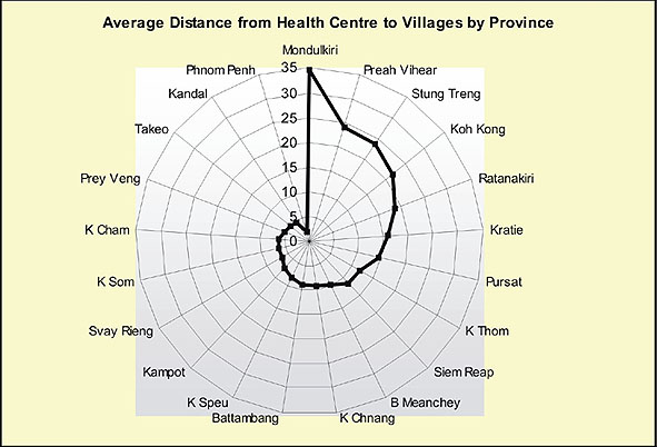 There are more than 13 000 villages in Cambodia, and current MOH Outreach Policy24 dictates that each village should be reached once a month by health centre staff. It was recently estimated that annual outreach requires travel funding for 1.4 million km per year. This tests the financial sustainability of sole reliance on outreach as a strategy for reaching rural populations. The variation and distance within the social and physical landscape provides added impetus for a decentralized planning strategy that takes into account the real geographic distances and sociological conditions of marginal populations, in order that the most disadvantaged children can be reached by the health system.