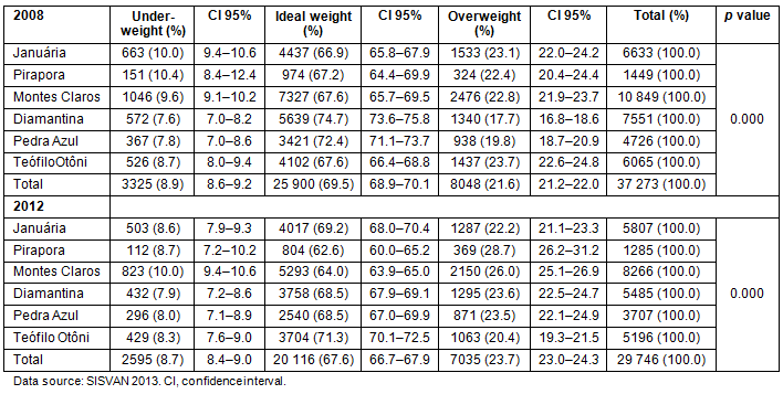 Data from 2008 and 2012 were collected directly from the SISVAN site (via http://nutricao.saude.gov.br) in February 2013. The data were entered into Statistical Package for the Social Sciences software v17 (SPSS; http://www.spss.com), and the following analyses were applied: descriptive statistics, confidence intervals (CI 95%) and χ2 tests (p<0.05).