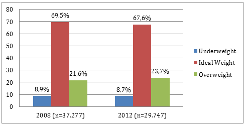 Figure 1: Underweight, ideal weight, and overweight children in northern and north-eastern Minas Gerais in 2008 and 2012.