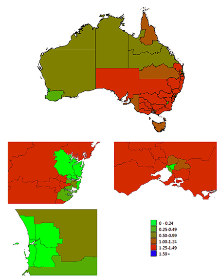 Figure 2: Estimated 12-year-old decayed, missing or filled teeth for each local government region of Australia (all those with a population of fewer than 50 12-year-olds are left blank). High-magnification views of capital cities (Sydney, top left; Melbourne, top right; Perth, bottom left) are presented below the national map.