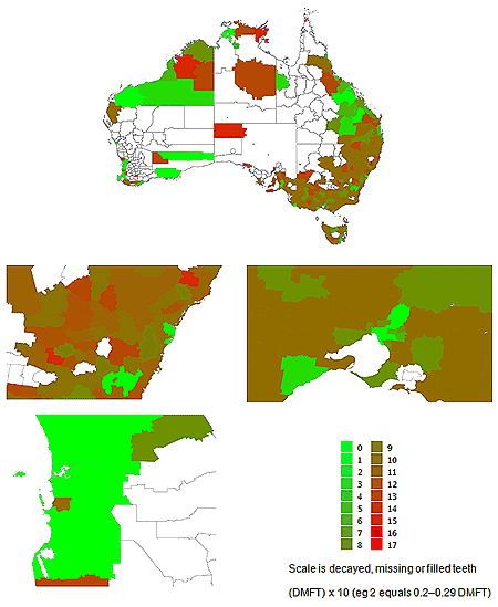 All data was from open sources and therefore no ethics approval was required for the study6-9. All data collected and reported is for 12-year-olds unless otherwise stated. Based on previous studies it is accepted that dental decay in Australian children is strongly linked to socioeconomic strata; poorer children suffer greater levels of decay. In addition, it has been previously clearly identified by the authors of this study (and others) that Indigenous children suffer greater levels of decay than other children10-15. Against this backdrop these two factors (socioeconomics and Indigenous status) were chosen as the drivers of the simulations to generate child-by-child DMFT for 12 year-olds living in Australia. The process of simulation has been previous published and will not be covered in detail here5. In short, the simulation rests on the application of rates of decay (and missing and filled teeth) for different subsets of the population (as published in the literature) applied in a randomly seeded approach to the entire population (in this case all Australian 12-year-olds). In this simulation of socioeconomic status, Indigenous status and population numbers were collected from the most recent census (where complete data is available - 2006) to drive the simulation6-15. The simulation was completed using personally developed software (Visual Basic v6.0; http://msdn.microsoft.com/en-au/vbrun/ms788229.aspx). All resultant data was outputted to CSV (comma-separated values) format and imported into MySQL (community edition, Oracle USA; http://www.mysql.com) for analysis. The outcomes of the simulations were clustered at various geographic levels, and these were imported into QGIS (v1.8.0, open source, http://www.qgis.org/en/site) with the matching boundary files to map the outcome data to geography. Boundary files for state, statistical regions (SR) and local government areas (LGAs) were used.