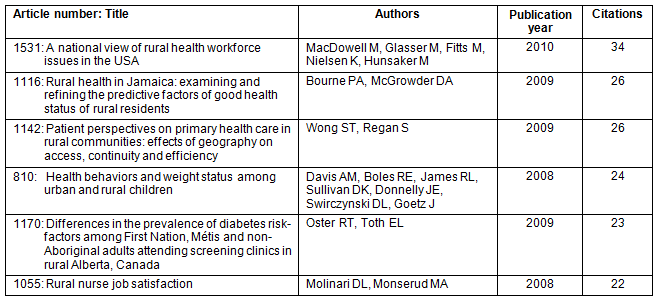 Table 2: Six most highly cited North American Rural and Remote Health articles since May 2008
