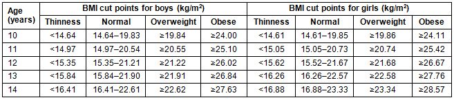 Table 1: International Obesity Task Force cut points used to classify participating youth into the body mass index (BMI) categories of 'thinness', 'normal', 'overweight' or 'obese'25,26