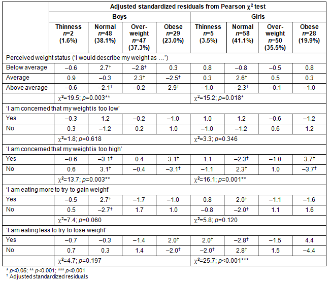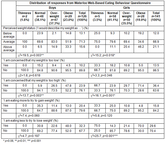 The belief that one's weight was too low was not significantly associated with BMI for either boys or girls. However, it is interesting that about one-tenth of both overweight boys (9.4%) and girls (10.8%) reported being concerned that their weight was too low. Further, 4.5% of obese boys and 5.0% of obese girls shared the same concern. Body mass index was, however, significantly associated with being concerned that one's weight was too high for both boys (p=0.003) and girls (p=0.001). Far more normal weight girls (23.9%) shared this concern as compared to boys (5.9%). For the overweight category, similar proportions of boys (26.5%) and girls (29.7%) believed that their weight was too high. In the obese category, a far greater proportion of girls (71.4%) shared this concern as compared to boys (47.8%).