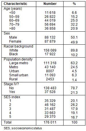 The median age of presentation was 71 years (mean age 69.2 years). As shown in Table 1, a majority of patients were classified as white with non-metastatic disease, and gender was evenly distributed. A large percentage of patients (63.2%) were from counties classified as large metropolitan.