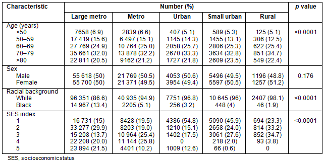 Table 2 outlines patient demographics along the urban-rural continuum. Urban and rural counties have slightly more patients >70 years old. Patients in large metropolitan counties had a greater number of African-Americans, and the number of African-Americans decreased almost linearly as county population decreased. Counties with smaller population had higher proportions of individuals in the lowest SES quintiles.