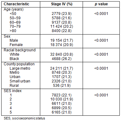 Stage IV: Presentation with metastatic disease is outlined in Table 3. Patients from metropolitan counties with a population <1 million presented less frequently with metastatic disease. African-Americans had higher rates of metastatic disease than their white counterparts: 26.2% and 20.8%, respectively. Patients in the groups reflecting the extremes of age (<50 years and >80 years) had slightly higher rates of stage IV disease, as did men and patients residing in counties in the lowest SES quintiles.