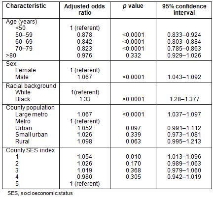 Stage: Table 4 shows the results of a multivariate logistic regression analysis of stage at presentation. Data presented are adjusted odds ratio estimates (adjusted for the other factors in the model) along with confidence intervals and p values. For each factor in the model, a referent was selected and odds ratio estimates are presented in terms of the increase (or decrease) in odds versus the referent. The lowest county SES was associated with an increased odds of stage IV disease and African-Americans had higher odds of presenting with metastatic disease, odds ratio (OR) 1.327 (p<0.0001). Using metropolitan counties with population <1 million as referent, patients in larger metropolitan counties had slightly higher odds of presenting with metastatic disease (adjusted OR 1.067 and p<0.0001). No other significant relationships were evident between county population and stage.