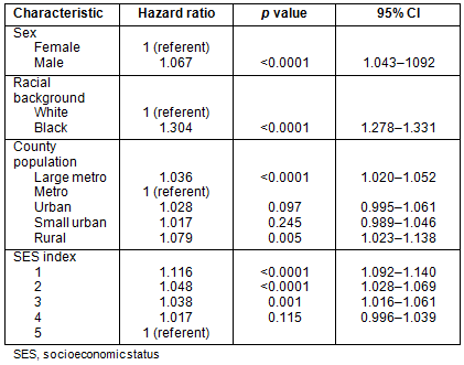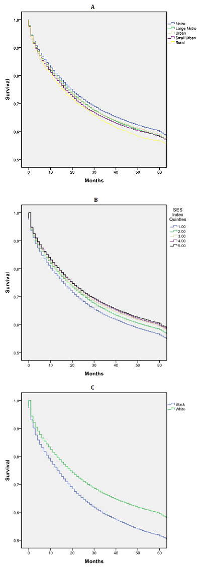Survival: Patients residing in large metropolitan and rural counties had diminished survival when compared to those residing in metropolitan counties with populations <1 million (Table 5). These differences are modest, but do persist when controlling for age, sex, race and SES index. African-Americans had a significant survival disadvantage compared to whites, with a hazard ratio of 1.304 (p<0.0001). Survival time is diminished for those residing in the lowest SES index counties.