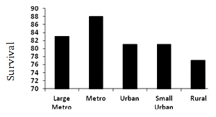 In order to simplify the urban-rural continuum schema, county population categories were condensed into the following categories: large metropolitan (>1 000 000), metropolitan (250 000-1 000 000), urban (20 000-250 000), small urban (2500-20 000) and rural (<2500). Socioeconomic status was defined using a modification of an index originally reported by Robert et al.; this index has been used to estimate county level SES in other large data sets27,28. The SES index was constructed with variables available in the SEER Registries. Three domains were defined with county-level data: education (percentage of high school graduates), income (median income and percentage below the poverty line) and employment (percentage unemployed and percentage white collar). Each factor was divided into quintiles, with 1 reflecting the lowest SES quintile. The overall SES index was derived by summing scores from the aforementioned data points and again subdividing into quintiles to derive a score from 1 to 5.