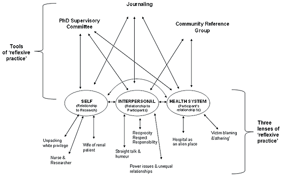 I have described how self-reflexivity and the unpacking of my white privilege resulted in my embrace of an Indigenist paradigm to inform methods used to explore the research question through the eyes of participants. Interpersonal reflexive practice explores and clarifies how multiple roles and the self are managed in relationships with others. Critical examination of the health system that Aboriginal patients must negotiate to access treatment is the third layer of reflexive practice as I examined issues such as institutionalised racism, victim blaming, and hospitals as daunting and alien environments.