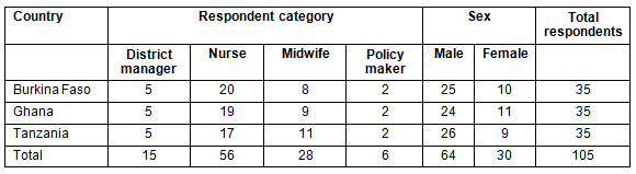 Respondents were selected through purposive sampling23. In particular, care was taken to include respondents of both sexes, spanning various age groups, from both the nursing and midwifery professions, and to include those with a facility management role. A total of 35 in-depth interviews were conducted in the three countries: 29 with MNH providers, four with members of the district health management team and two with policy makers at the national level. The selection of the districts in each country was also purposive, these districts being the future intervention districts for the QUALMAT study.