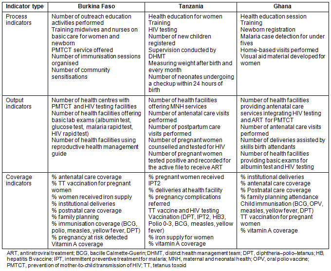The district managers had more specific suggestions, including the reduction of facility-based neonatal mortality or the number of pregnant women who were counselled and tested for HIV: